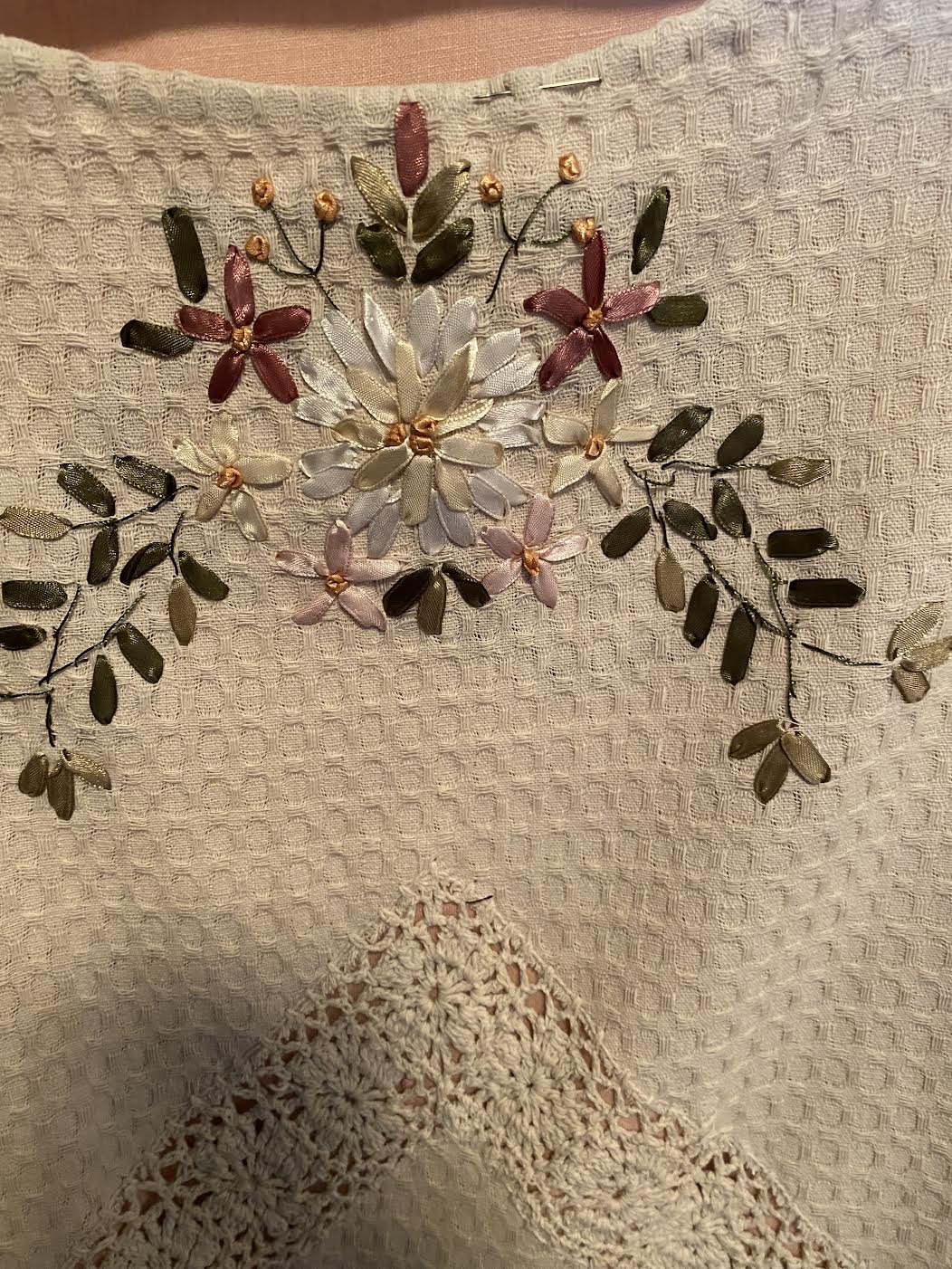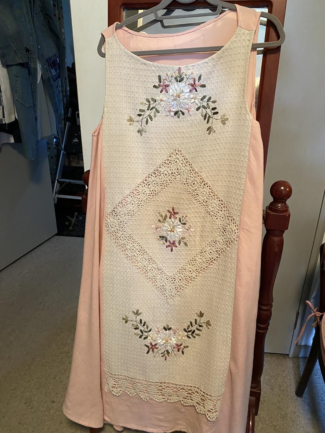 ID LT17.a Pink and cream hand made dress ribbon embroidered linen panel size L $150