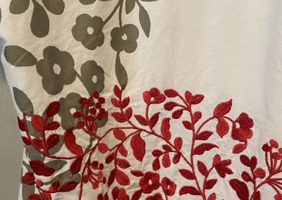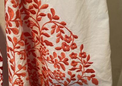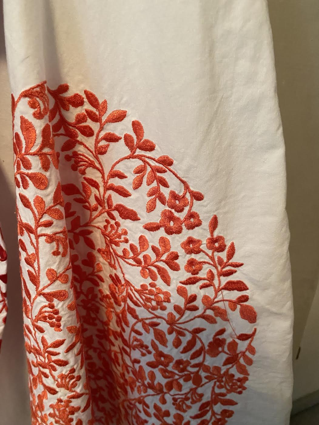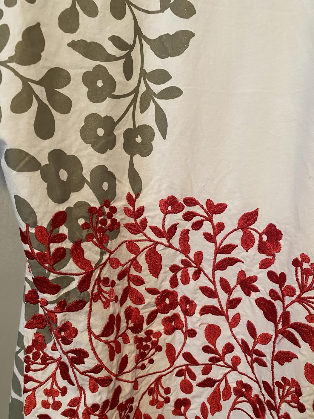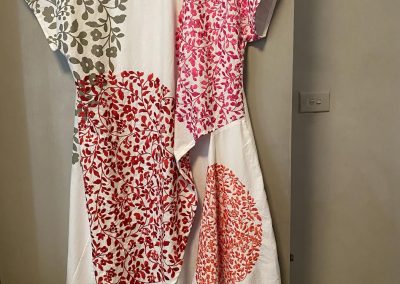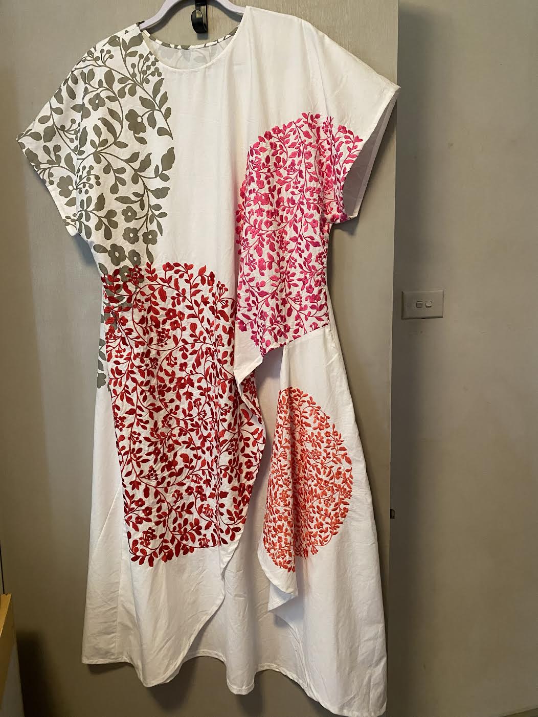 ID LT18.a White Pink and Orange casual dress hand made from upcycle fabric with printed and embroidered areas size L $180